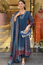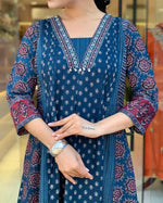 Elevate your ethnic wardrobe with this mesmerizing Navy Blue A-line Suit Set, a seamless blend of timeless elegance and everyday comfort. Crafted from premium pure cotton, the kurti is adorned with intricate hand embroidery and all-over subtle prints, offering a refined yet relaxed look.