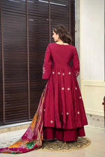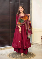 Red Colour Pure Muslin Fabric Gown And Pant Suit Set
